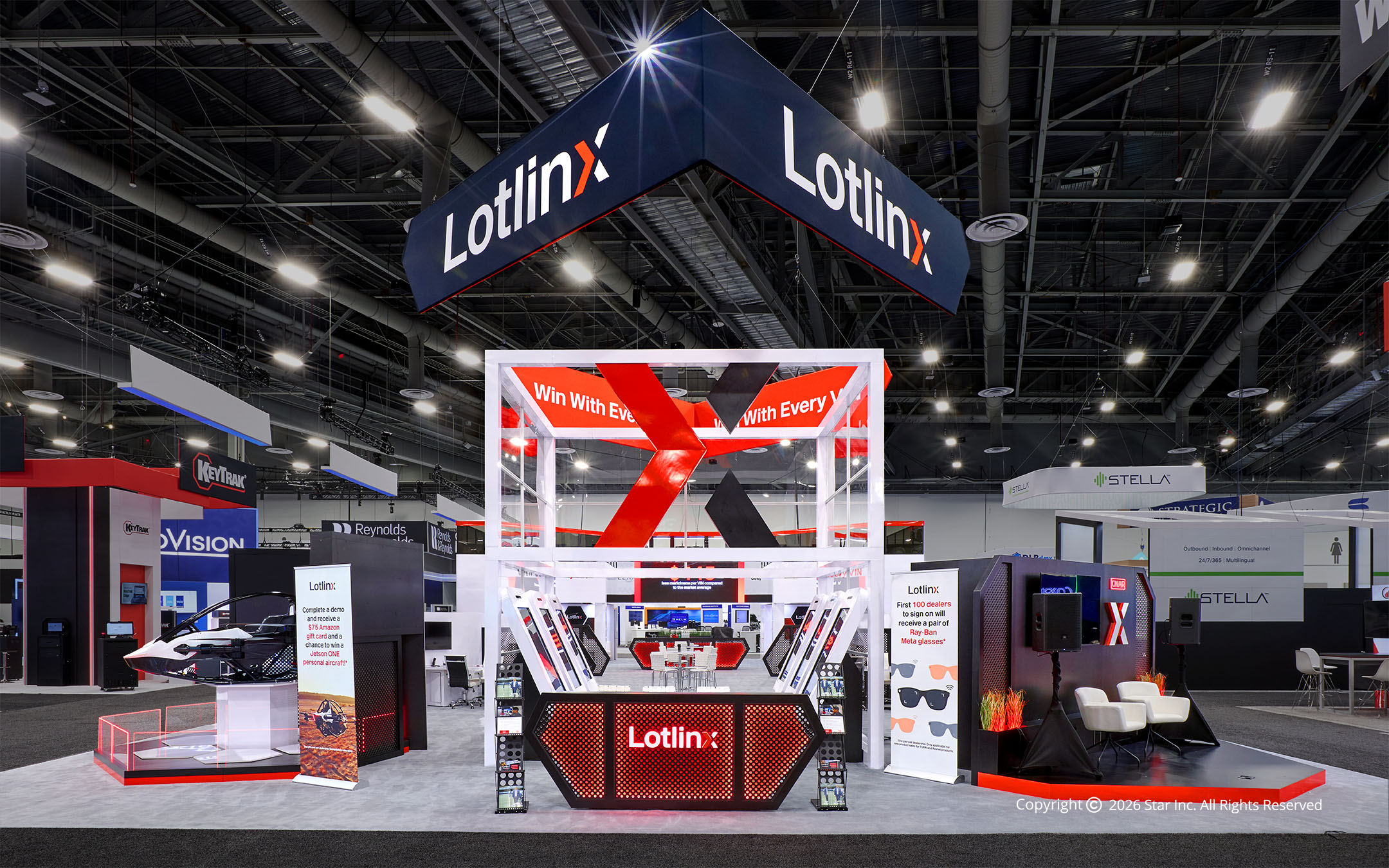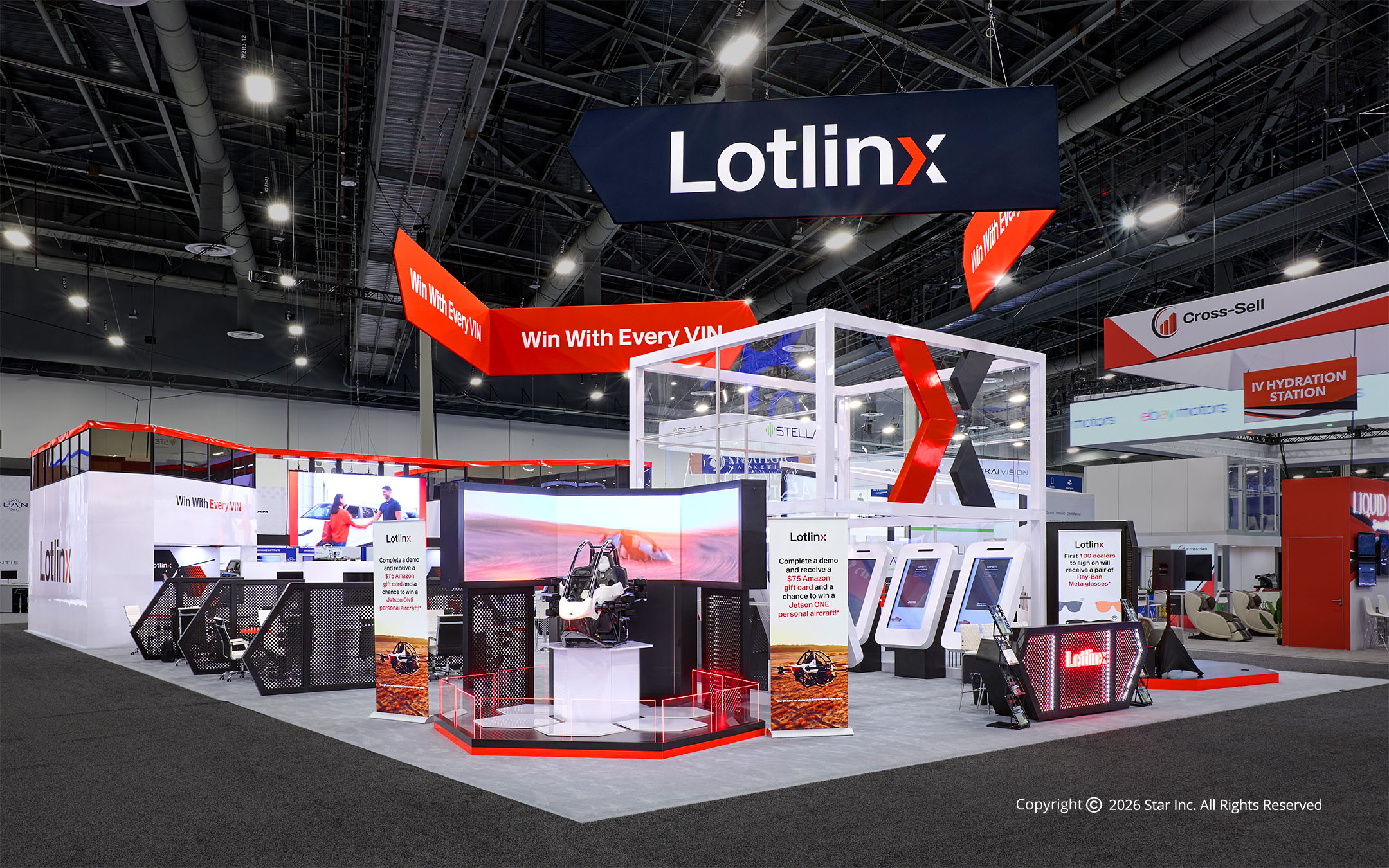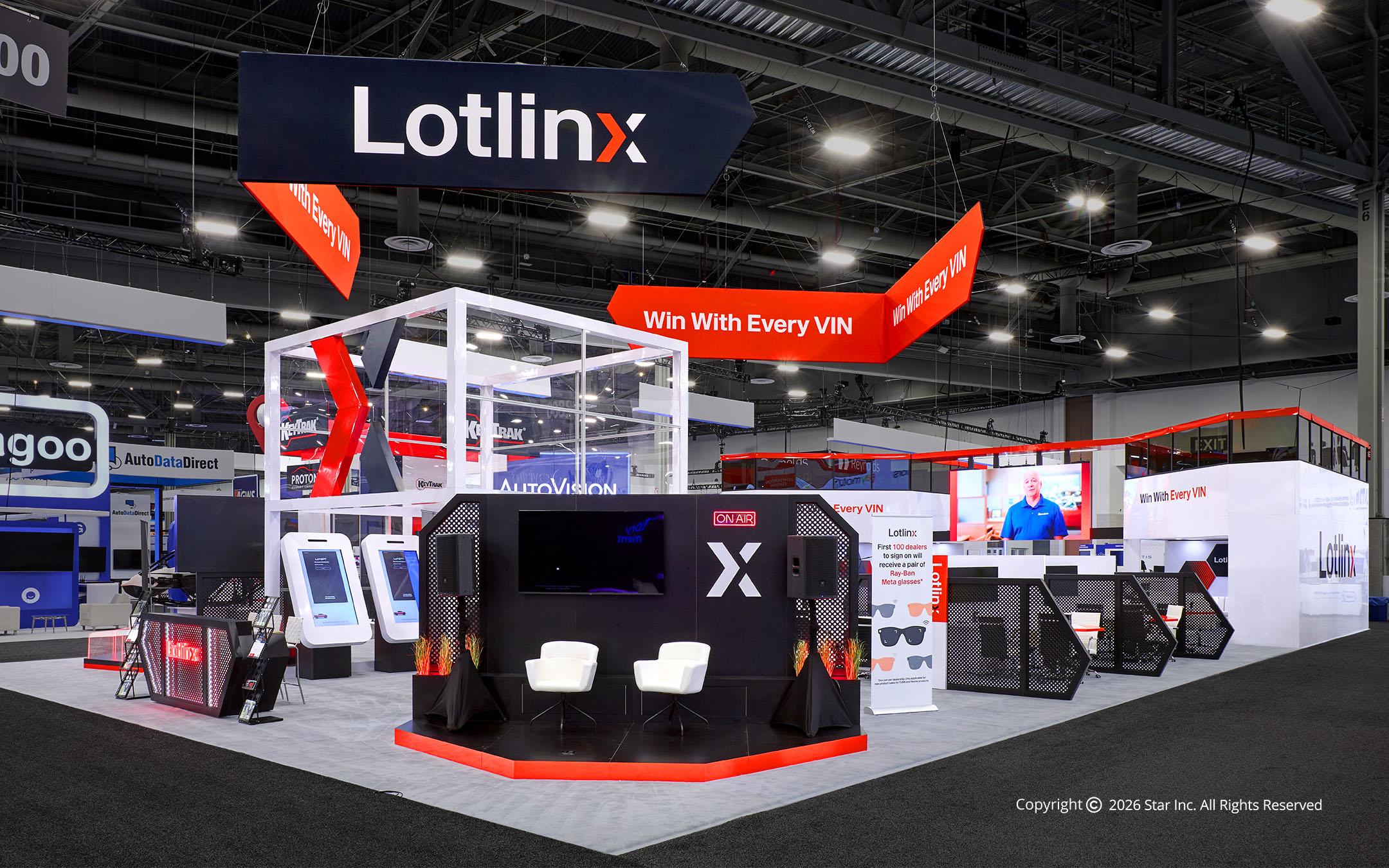 The Lotlinx NADA Exhibit at NADA was designed to bring data-driven automotive strategy to life through bold architecture and immersive engagement. Star Inc. created a high-impact environment featuring striking red angular elements, a central activation structure, and integrated demo zones that reinforced Lotlinx’s “Win With Every VIN” message. The result was a booth that commanded attention while clearly communicating performance-driven technology on one of the most competitive show floors in automotive retail.
